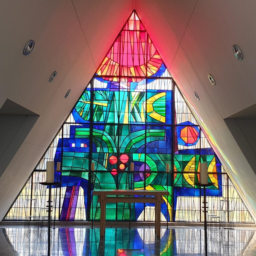 In de sobere, strakke architectuur loopt het dak door tot bijna aan de grond. Wie de aula’s binnenkomt, ziet aan het eind van het looppad, achter de plaats waar de kist met de overledene is opgesteld, een bijzonder driehoekig glasin-loodraam, opgebouwd uit zo’n vijfduizend gekleurde glassegmenten.