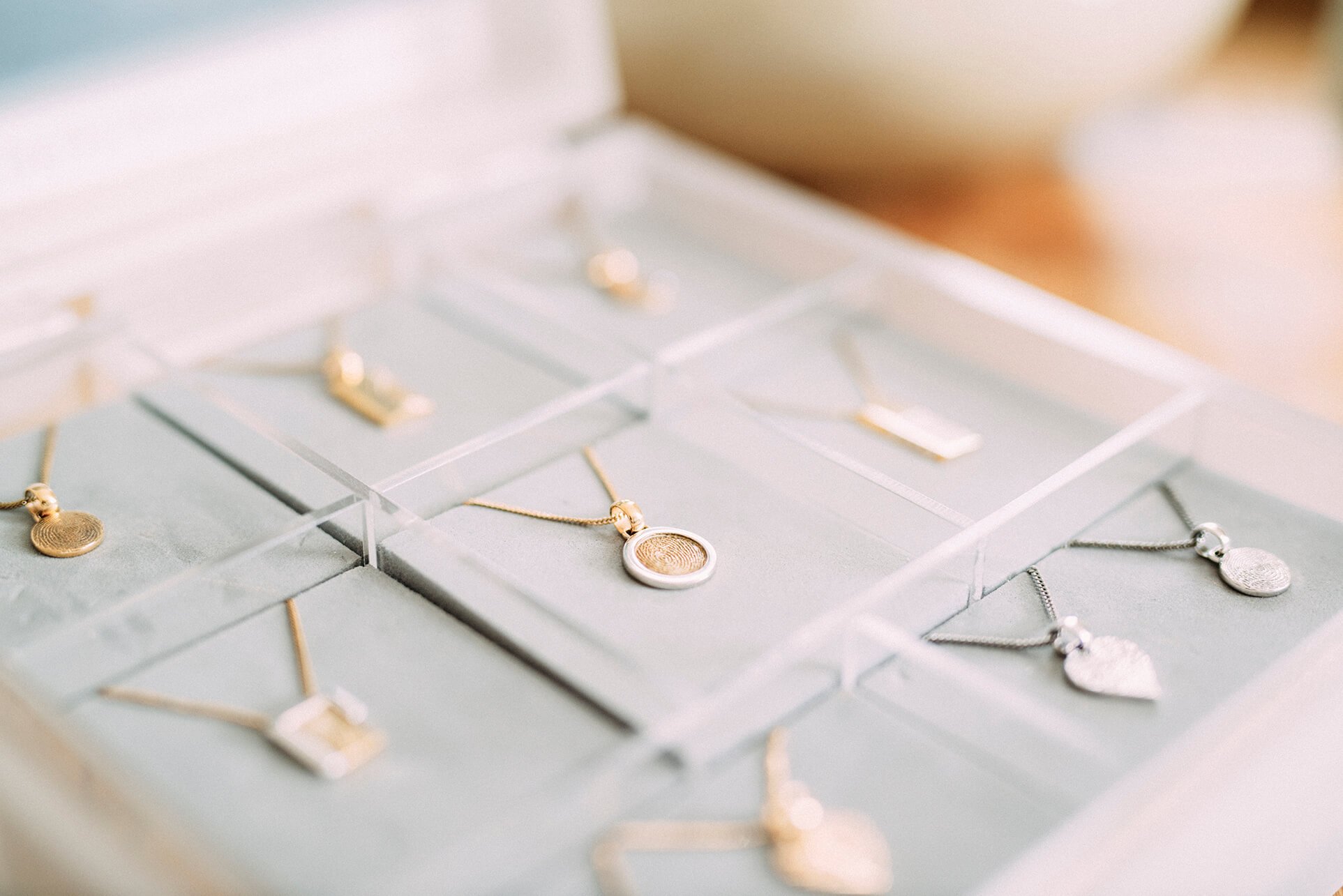In het goudsmidatelier wordt de vingerafdruk van uw dierbare tot een bijzonder en kwalitatief sieraad vervaardigd. Onze basiscollectie bevat acht verschillende modellen hangers in 14 karaats geel en/of wit goud en twee in het zilver. Uiteraard zijn er nog veel meer modellen en mogelijkheden zoals bijvoorbeeld ringen, dasspelden, oorbellen etc..