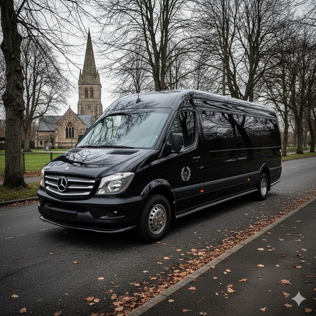 Deze moderne uitvaartbus, vaak gebaseerd op een Mercedes-Benz Sprinter chassis, biedt een discrete en multifunctionele oplossing voor groter rouwvervoer.